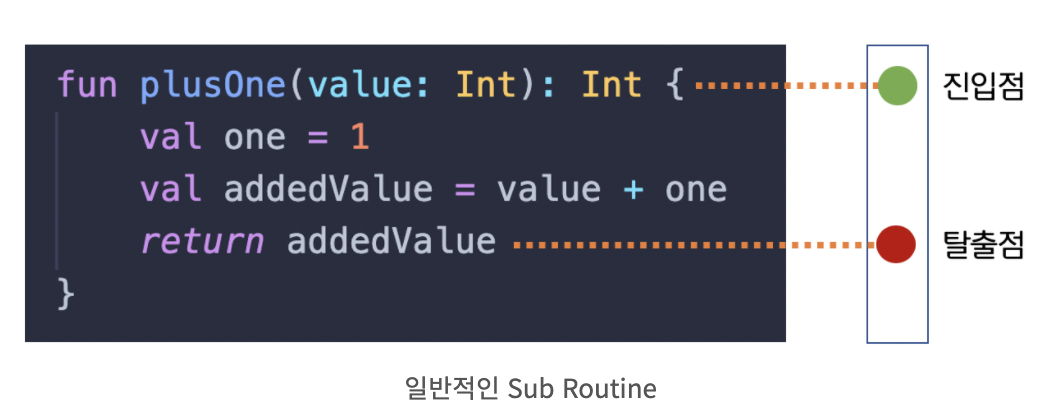 - 진입점과 탈출점이 여러 개여서 꼭 return을 만나지 않더라도 언제든지 서브루틴 실행 도중에 나갈 수 있고, 다시 나갔던 지점으로 돌아올 수도 있다. (서브루틴은 호출되었을 때 진입하고 return을 만나야 탈출하니까 코루틴이랑 약간 다르다.)