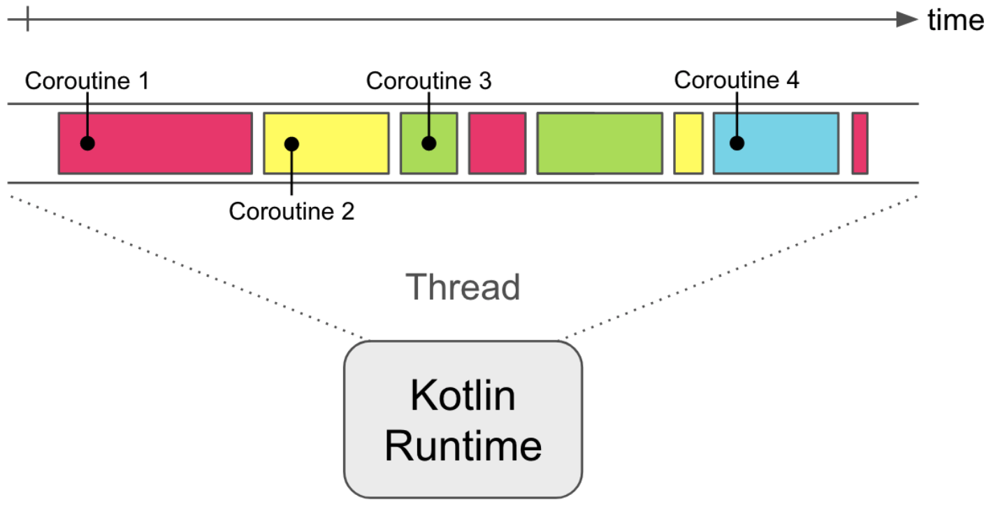 하나의 스레드에 코루틴이 여러 개 존재할 수 있는데, 실행 중이던 하나의 코루틴이 suspend(중단)되면, 현재 스레드에서 resume(재개)할 다른 코루틴을 찾는다. 근데 이제 이 다른 코루틴을 같은 스레드 내에서 찾는 것이다. 그니까... 스레드를 바꾸는 게 아니라서 switch 비용으로 인한 오버헤드가 없다.!