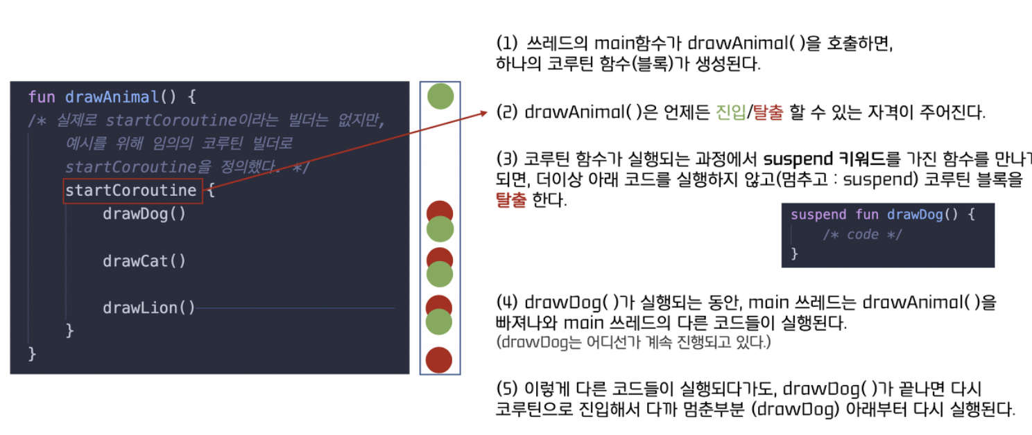 일반함수(drawAnimal())을 호출하면 이 함수는 이제 코루틴 함수가 되고 drawAnimal()을 언제든지 진입하거나 탈출할 수 있게 된다. 그렇게 이 drawAnimal()이라는 코루틴 함수를 실행하다가 이 내부에서 suspend가 붙은 함수를 만나면 더이상 아래 코드를 실행하지 않고 코루틴 함수를 탈출한다. suspend가 붙은 함수를 실행하는 동안 main 스레드는 drawAnimal()이라는 코루틴 함수를 나와서 다른 코드를 실행한다. 다른 코드들을 실행하다가도 suspend 함수가 끝났으면 다시 코루틴 함수에 진입해서 남은 코드를 실행한다.