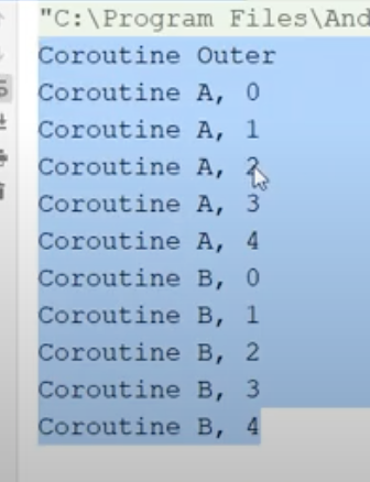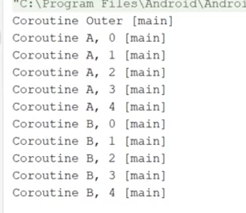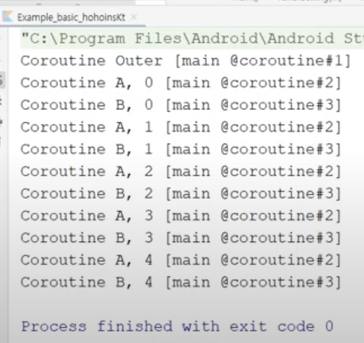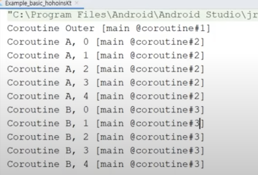 그랬더니! 첫번째 코루틴 실행하다가 suspend func인 delay가 호출되면서 일시중단되고, 그 동안 b 가 실행되고, b가 다시 일시중단 함수로 인해 일시중단이 되면서 다시 a 가 일어난다.