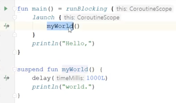 여기서 두번째 코루틴에 delay()를 넣어보자. 그러면 일시중단 마크가 나타난다. 그 이유는, delay함수안에 들어가면 suspend이다. 즉, delay를 만났을 때 얘를 호출한 launch 코루틴이 일시중단 될 수 있기 때문이다.
