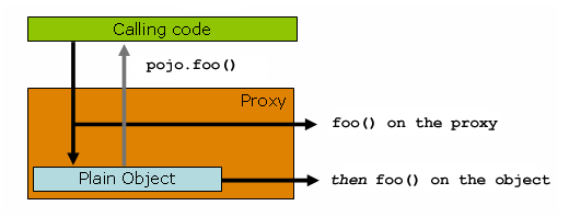 위처럼 일반 방식으로 메소드를 호출하면 그냥 그 즉시 객체에 접근한다. 그런데 프록시를 적용하면 pojo.foo라는 타겟을 요청하긴 하지만 DI를 통해 프록시가 주입되고 메소드 호출 시 프록시 내에서 모든 메소드 호출에 대한 interceptor들을 위임받아 설정한 Advice를 실행시킬 수 있게 된다. 이걸 실행한 후에 실제 foo를 호출한다.