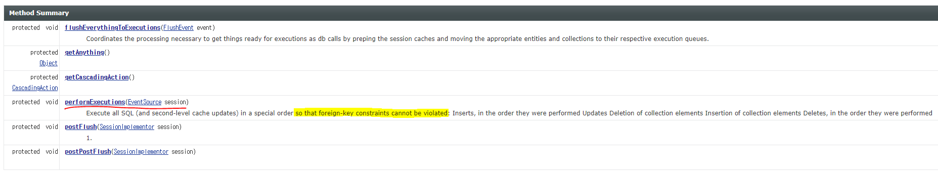 앞선 포스팅에서 말했듯이, 트랜잭션의 쓰기 지연 저장소에 있는 SQL문들이 한번에 실행될 때 performExecutions 라는 메소드가 실행되는데, 이에 대한 설명을 보면 아래와 같다.