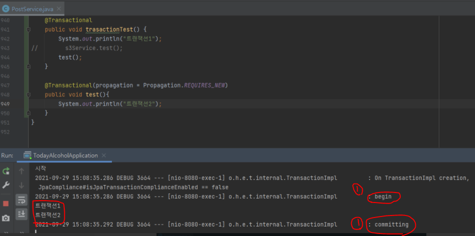 단, 첫 번째 트랜잭션에서 호출할, 또다른 트랜잭션으로 감싸진 메소드는 '같은 클래스'의 메소드다.