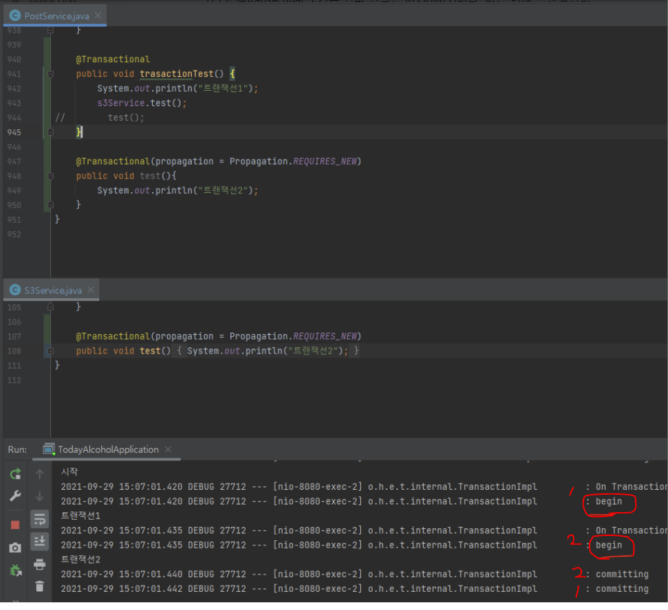 트랜잭션을 분리하고 두 트랜잭션이 중첩될 경우 requires_new를 통해 두 개의 트랜잭션이 각각 시작되게 한다.
