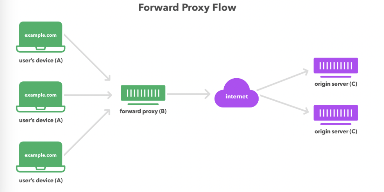 여기서 Forward Proxy는 유저 컴퓨터들의 중개인으로서 유저들의 행동을 감독하고 보안을 유지하기 위해 사용된다.