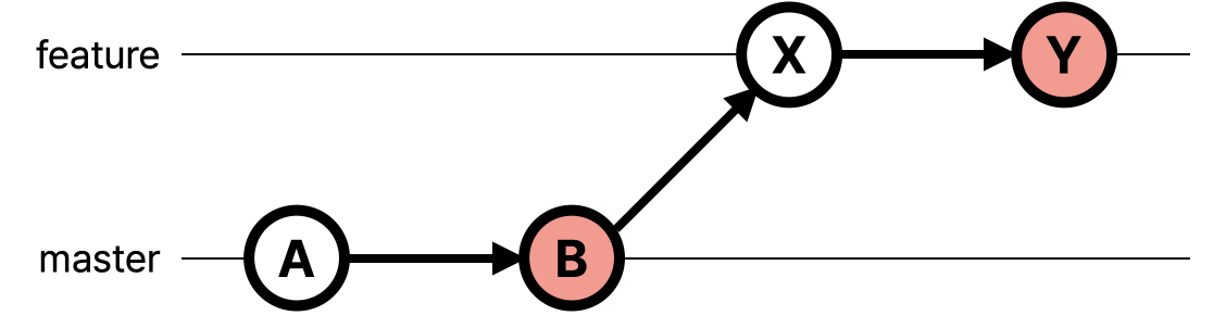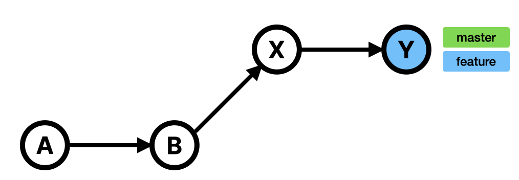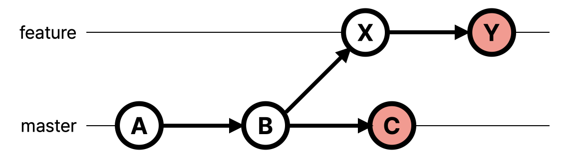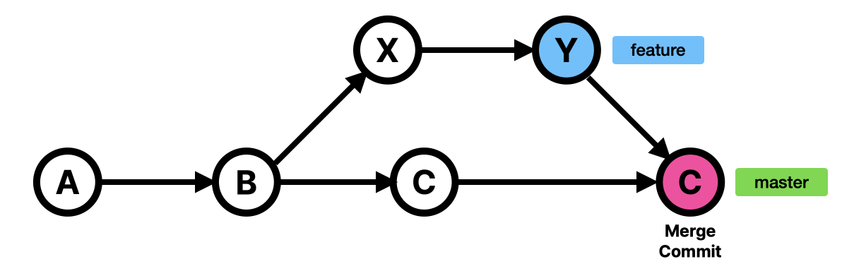 분기된 feature 브랜치의 커밋 히스토리는 A-B-X-Y인데 기존 브랜치인 master의 현재까지의 커밋 히스토리가 A-B-C이다. feature의 히스토리가 master의 히스토리를 모두 담고 있지는 않다. C가 새로 생겼다. 여기서 둘을 merge하면 새로운 merge 커밋이 생기는 것이 어쩌면 당연한 것 같다. feature 입장에서는 인지하지 못한 새 커밋이 생겼으니까 말이다...! 아무튼 merge commit을 생성하면서 병합된다.