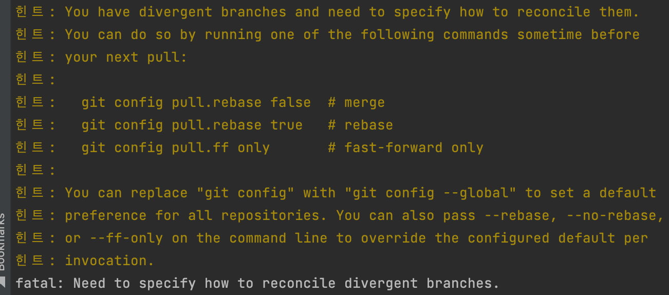git pull을 어떻게 할지 전략이 세가지가 있으니 선택해서 명시해달라는 내용이다.