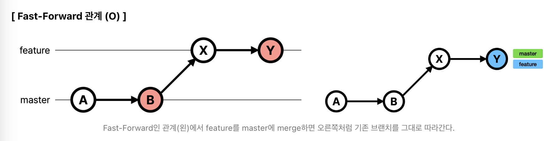 master에서 feature로 분기된 브런치의 커밋 히스토리는 A-B-X-Y이다. 글고 기존 브랜치인 master의 커밋 히스토리는 A-B이다. 따라서 분기된 브랜치인 feature의 히스토리는 기존 master 브랜치의 히스토리를 포함하고 있으니 이는 Fast-Forward 관계다. 이런 관계에서 master 브랜치에서 git merge [feature브랜치명]을 실행해서 병합하면 merge에 대한 new commit이 생기지 않고 HEAD의 위치만 변하게 된다. 브랜치를 그대로 따라가게 된다.