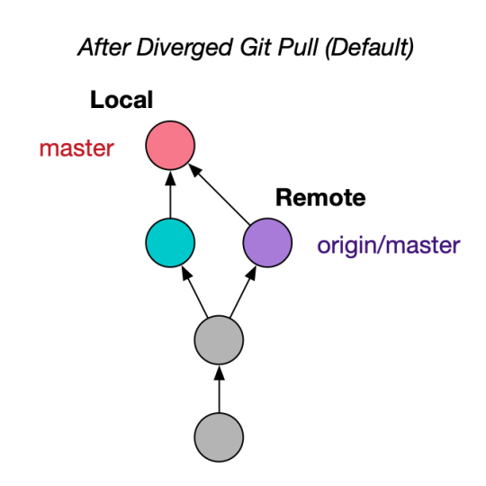 여기서 별도의 옵션을 주지 않은 채로 default대로 git pull 또는 git pull origin master를 실행하게 되면 아래처럼 된다. local master랑 remote의 origin/master가 합쳐지면서 새로운 commit(불필요한)이 생기는 문제가 발생한다. 우리가 자주 보던 merge commit을 말하는 거임!
